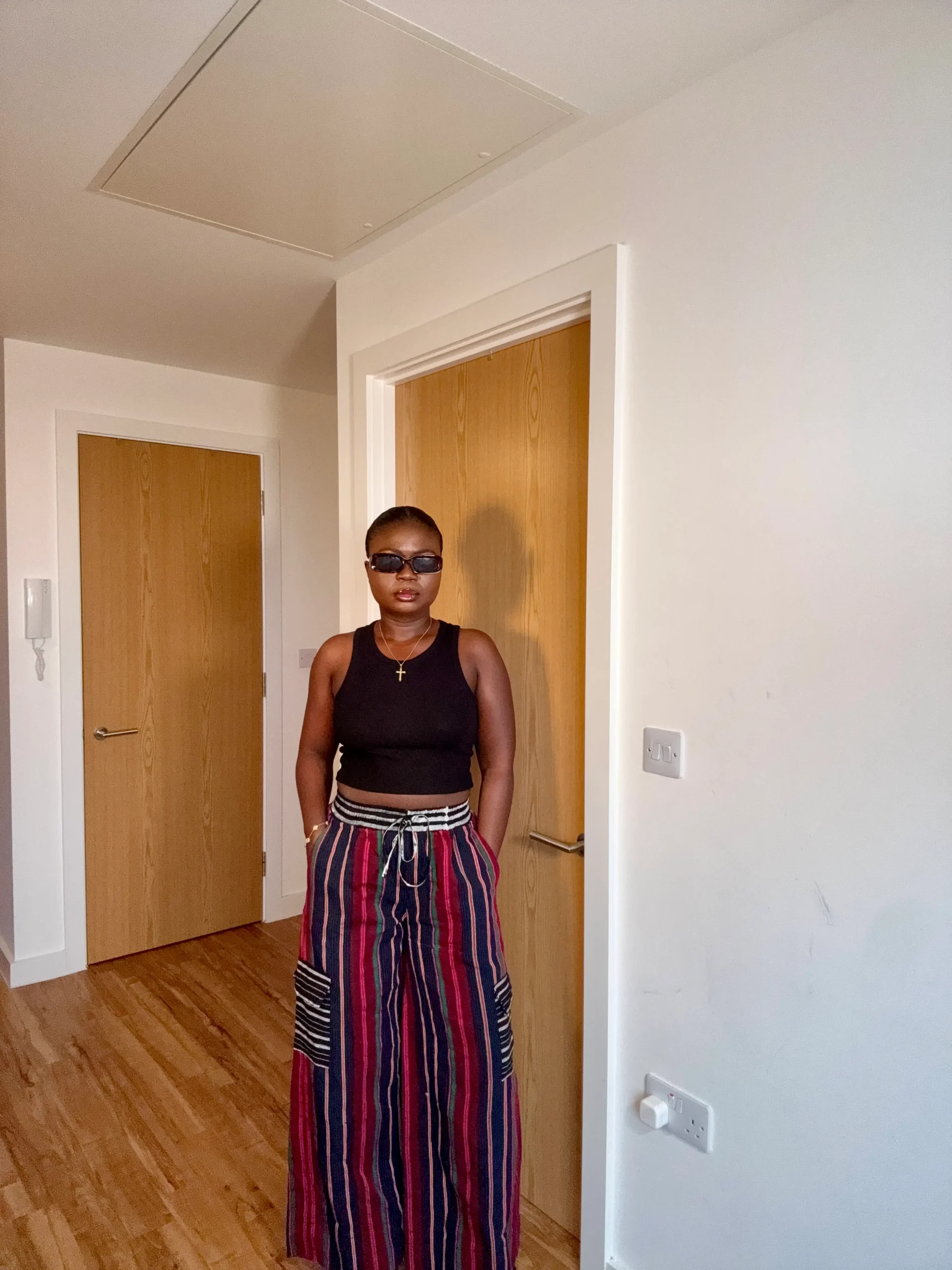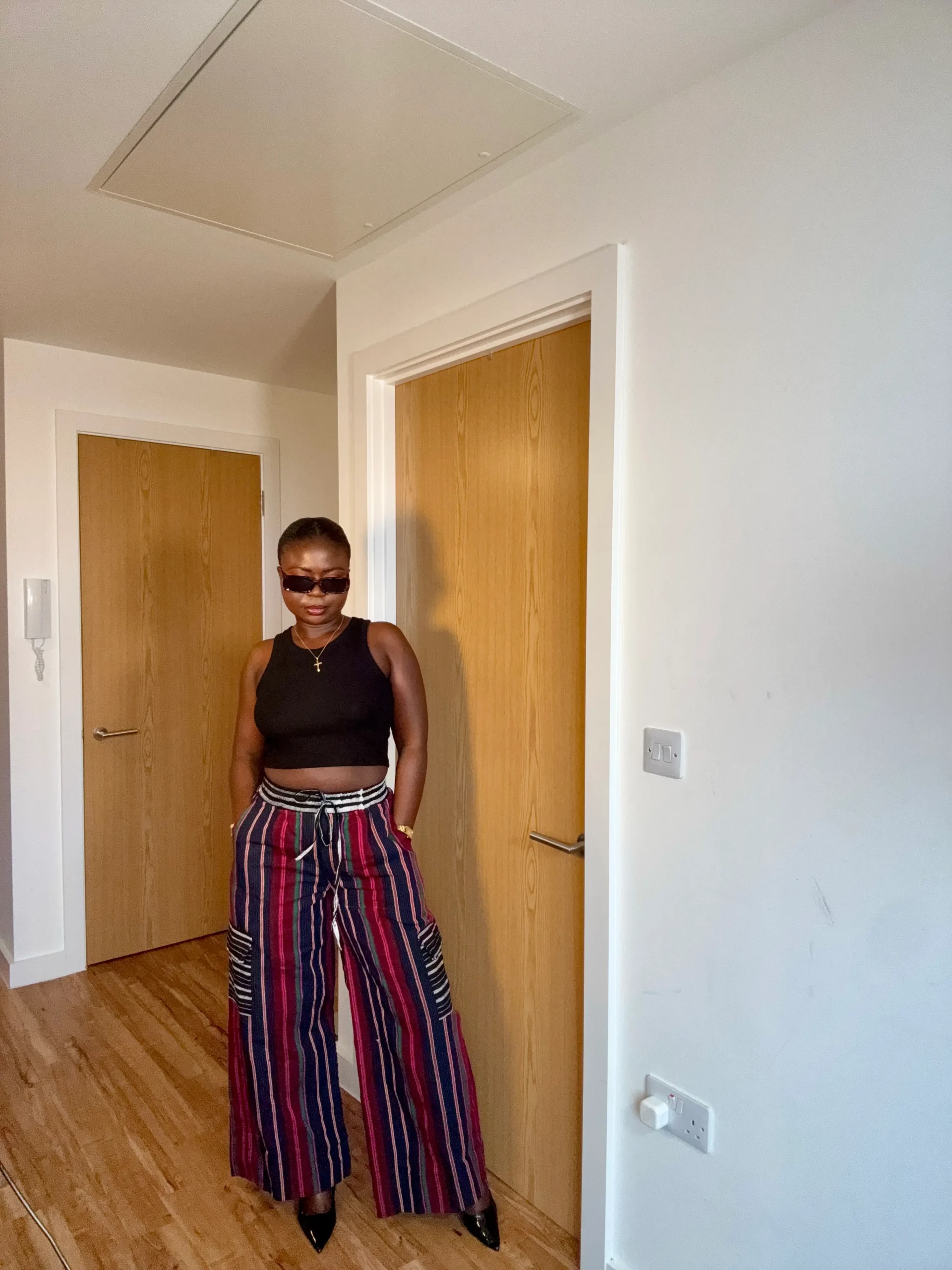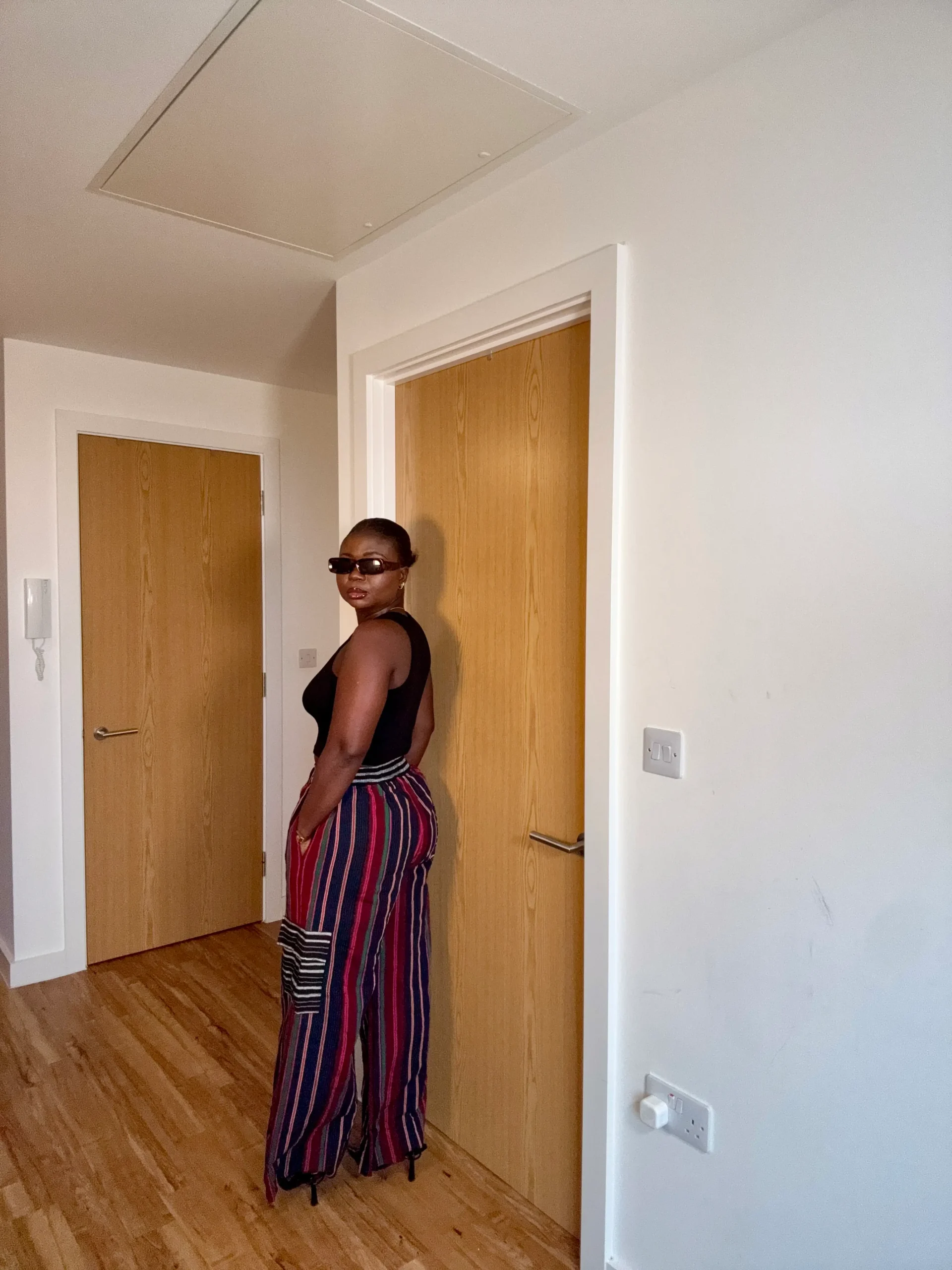 A modern twist on a traditional fabric. The Simbi Aso Oke Pant in multi coloured features a stunning woven texture and a chic waist belt that cinches beautifully. It’s a blend of heritage and bold style designed to stand out.