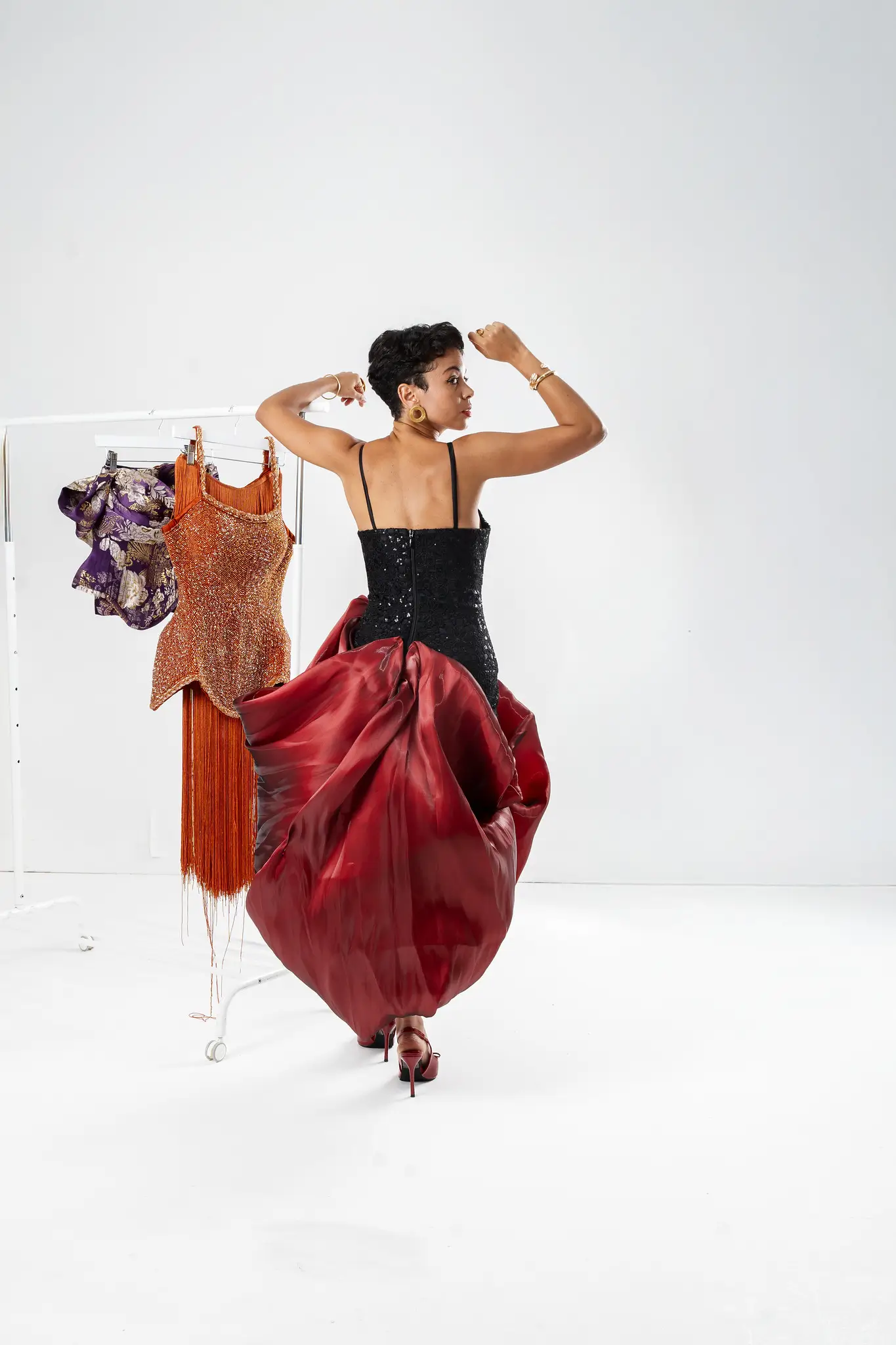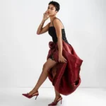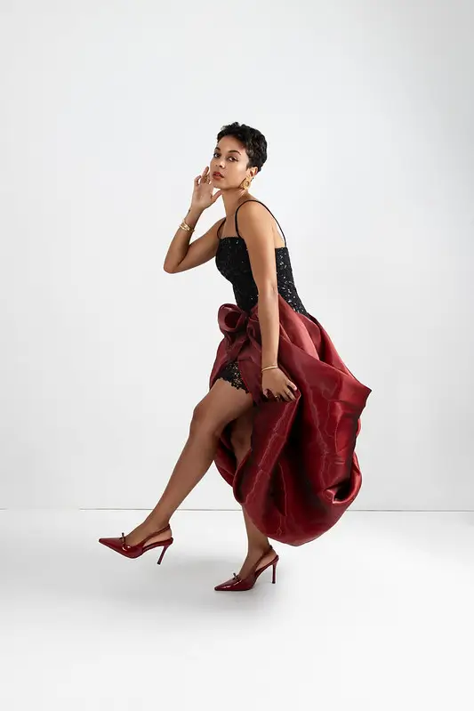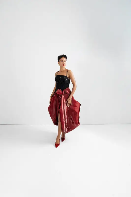 Cut from liquid organza, it cascades into a dramatic skirt with a daring slit, moving like poetry in motion. Maroon floral details bloom across the fabric, creating contrast that captivates at every glance. The Zuri is unforgettable ; opulent grace, redefined.